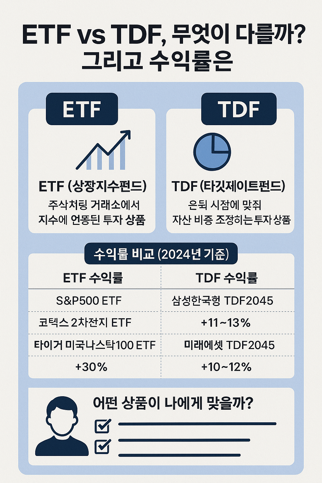 ETF는 공격적인 투자자에게, TDF는 장기적인 목표가 뚜렷한 안정지향 투자자에게 적합합니다. 중요한 건 수익률만 볼 것이 아니라, 자신의 투자 성향과 목적에 맞는 상품을 선택하는 것입니다.