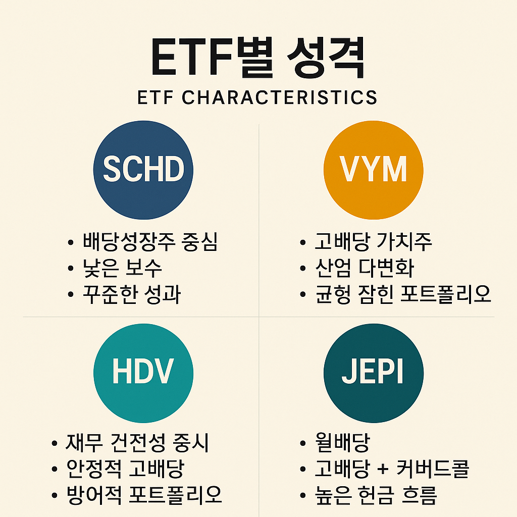 미국 배당 ETF 비교: SCHD vs VYM vs HDV vs JEPI